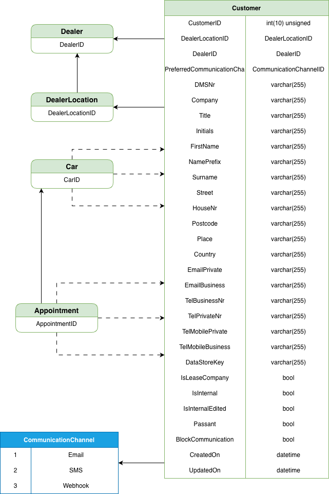 If a communication was sent to the customer (Online check-in, Diagnose overview, Repair overview) the Appointment contain a key in the customcom_key field.